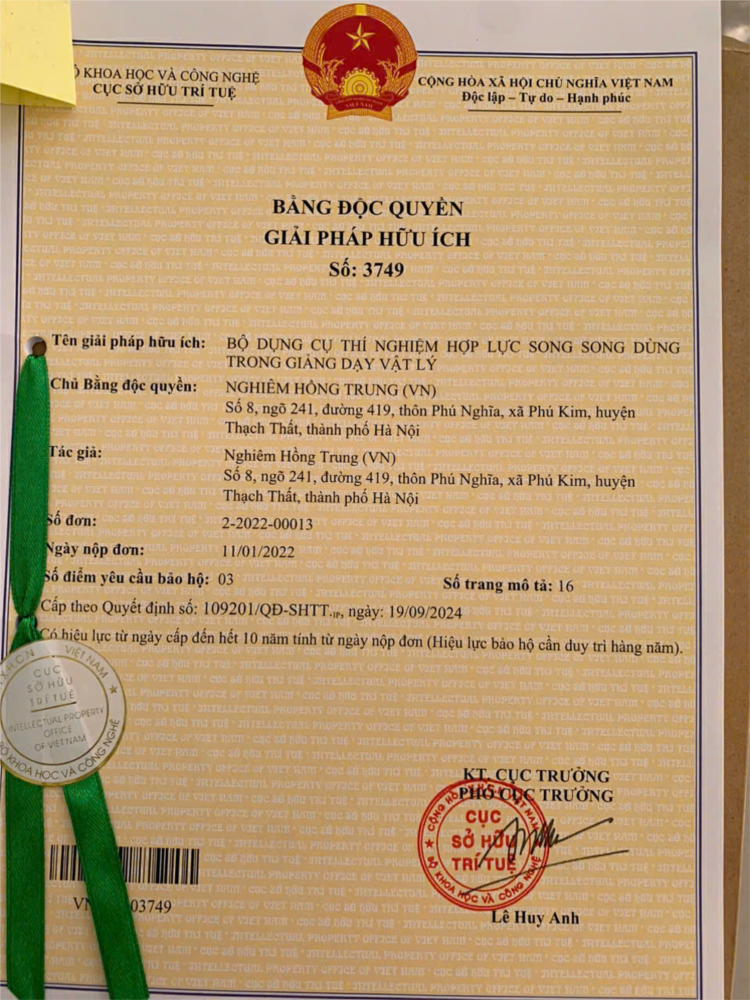 2024 – Nghiêm Hồng Trung: Bộ dụng cụ thí nghiệm hợp lực song song trong giảng dạy vật lý (Số 3749 Bộ Khoa học và Công nghệ; Cục Sở hữu trí tuệ)