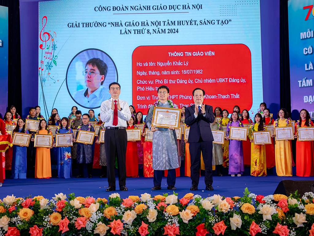 Ngày 14-11, vinh dự được thay mặt cho những gương mặt đạt giải Nhà giáo Hà Nội tâm huyết, sáng tạo lần thứ 8 năm 2024, thầy giáo Nguyễn Khắc Lý, Phó Hiệu trưởng trường THPT Phùng Khắc Khoan, Thạch Thất chia sẻ: "Đây là một phần thưởng vô cùng ý nghĩa với bản thân tôi. Tôi sẽ luôn trân trọng và coi đây là động lực để cố gắng, phấn đấu và cống hiến cho sự nghiệp giáo dục của nhà trường và của Thủ đô.